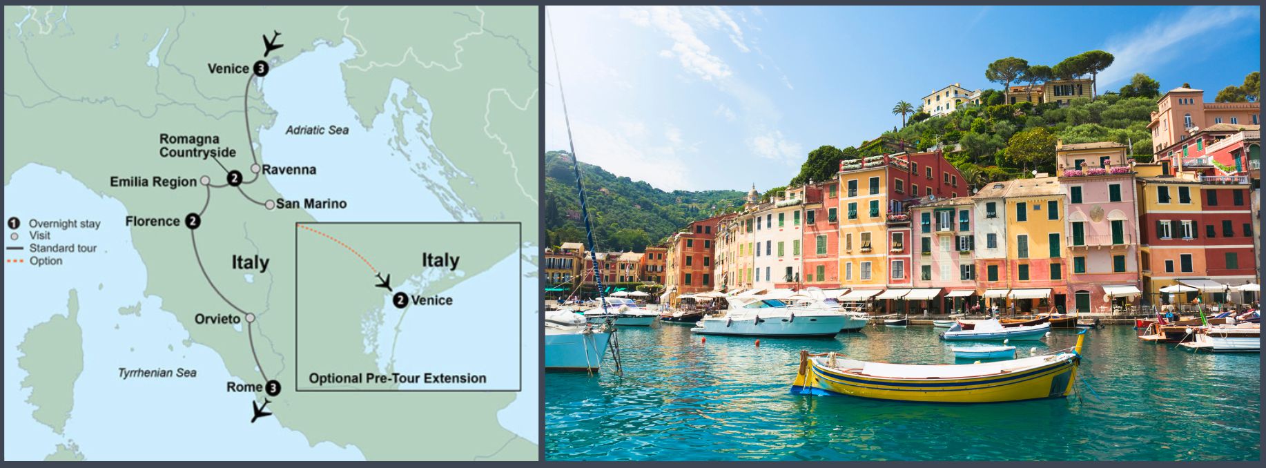Join us for a fabulous Italian adventure featuring the magic of Venice, Florence and Rome. Journey to the wine-producing Romagna countryside for a two-night stay in a wine resort, and visit the Republic of San Marino, an enclave state of Italy. Come along with us and embrace the history, culture, art and romance of this incredible country.