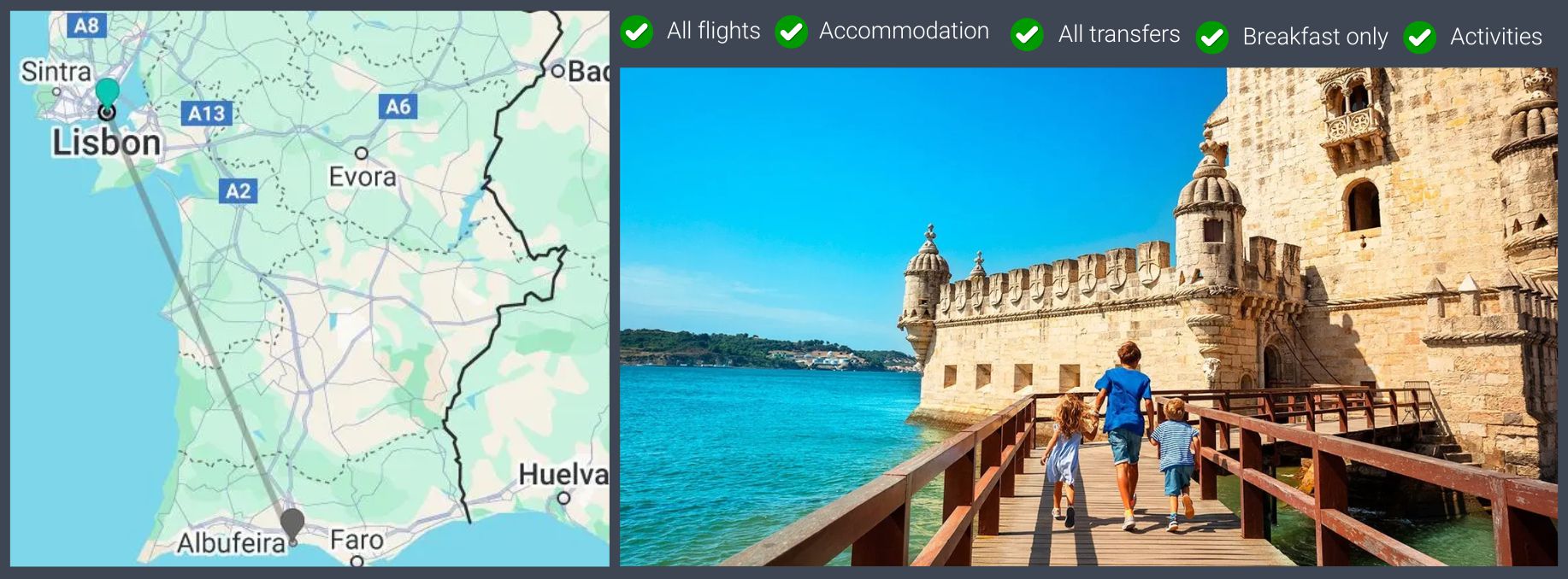 Begin in Lisbon, Portugal’s capital, and walk around the city center on a guided tour where you'll stop to admire the famous Monastery of Jerónimos and the Tower of Belém. Continue to Albufeira and enjoy its golden beaches by the Atlantic with plenty of free time. Head back to Lisbon to visit your favorite spots or have fun with some optional activities that your kids will love.